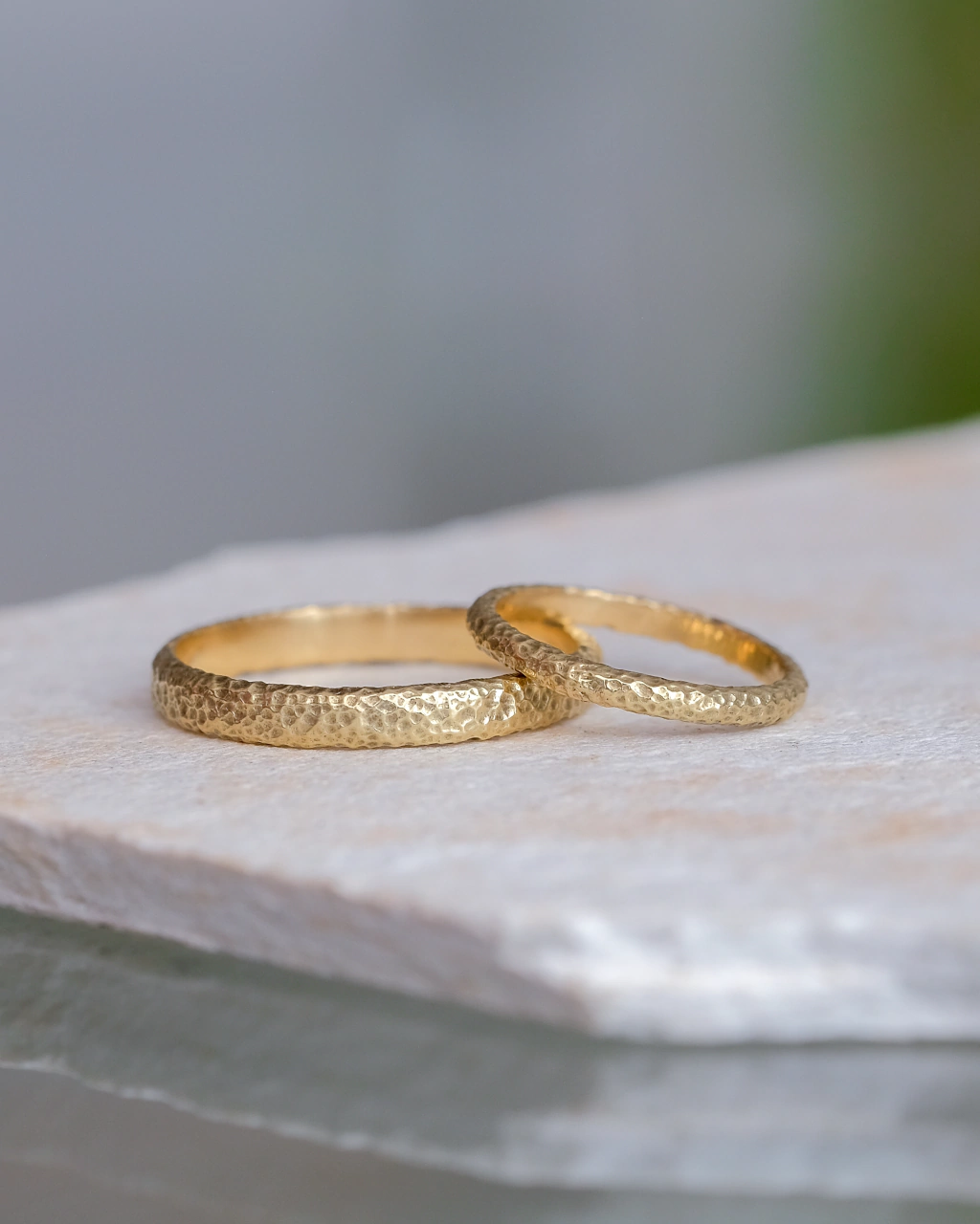 Par de alianzas hechas a medida en Oro 18k Amarillo, de 2mm y 3mm de ancho, con una suave textura tallada.