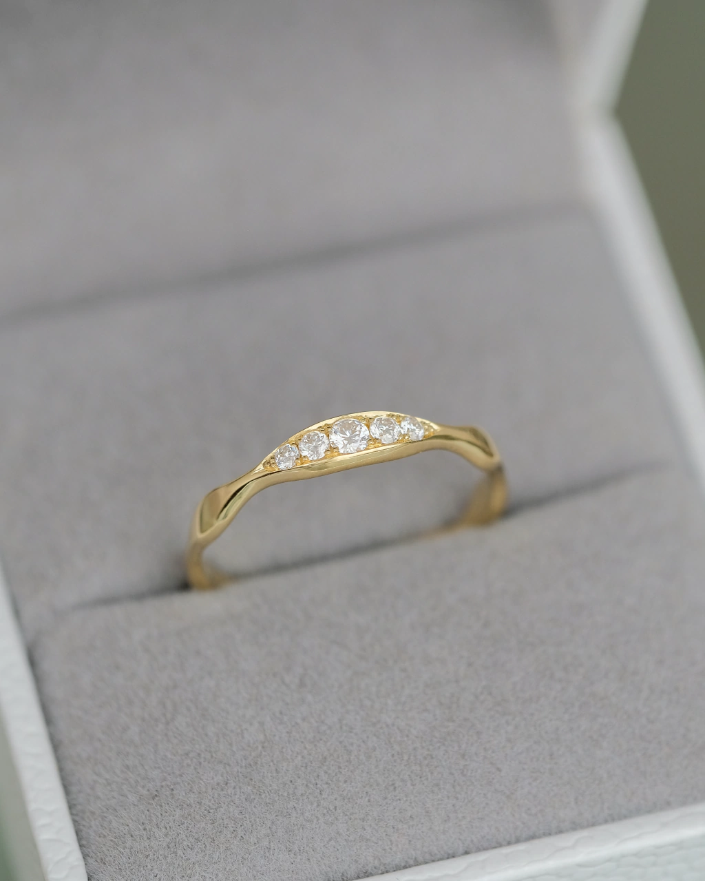 Diamantes naturales emergen en forma de degradé sobre una banda ondulada de oro 18k rojo, dando lugar a este anillo de compromiso o aniversario luminoso y único, ideal para aquellas parejas que les apasione viajar y conectar con el océano!