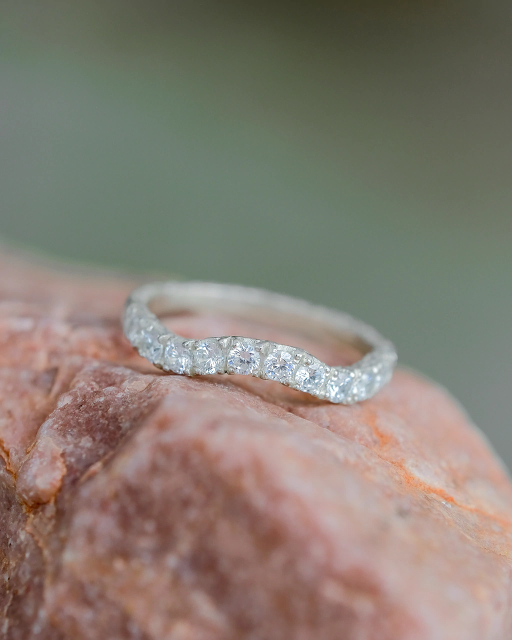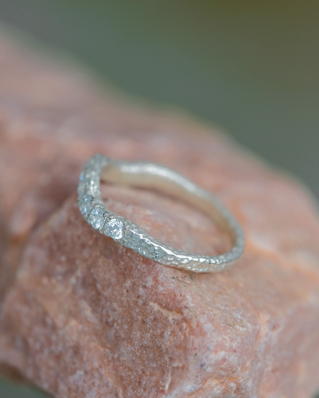 Diamantes naturales emergen en sobre una banda ondulada con una textura tallada, dando lugar a este anillo de compromiso o aniversario luminoso y único, ideal para aquellas parejas que les apasione viajar y conectar con el océano!
