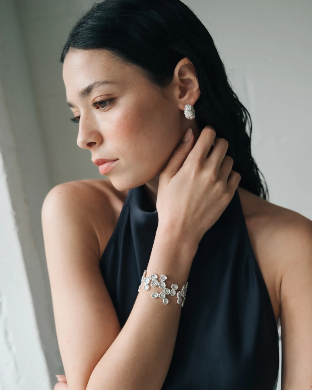 Hechos con moldes de caracoles marinos, los aros Mini Orilla evocan el encuentro entre el mar y la arena: una forma natural que guarda memoria del movimiento.